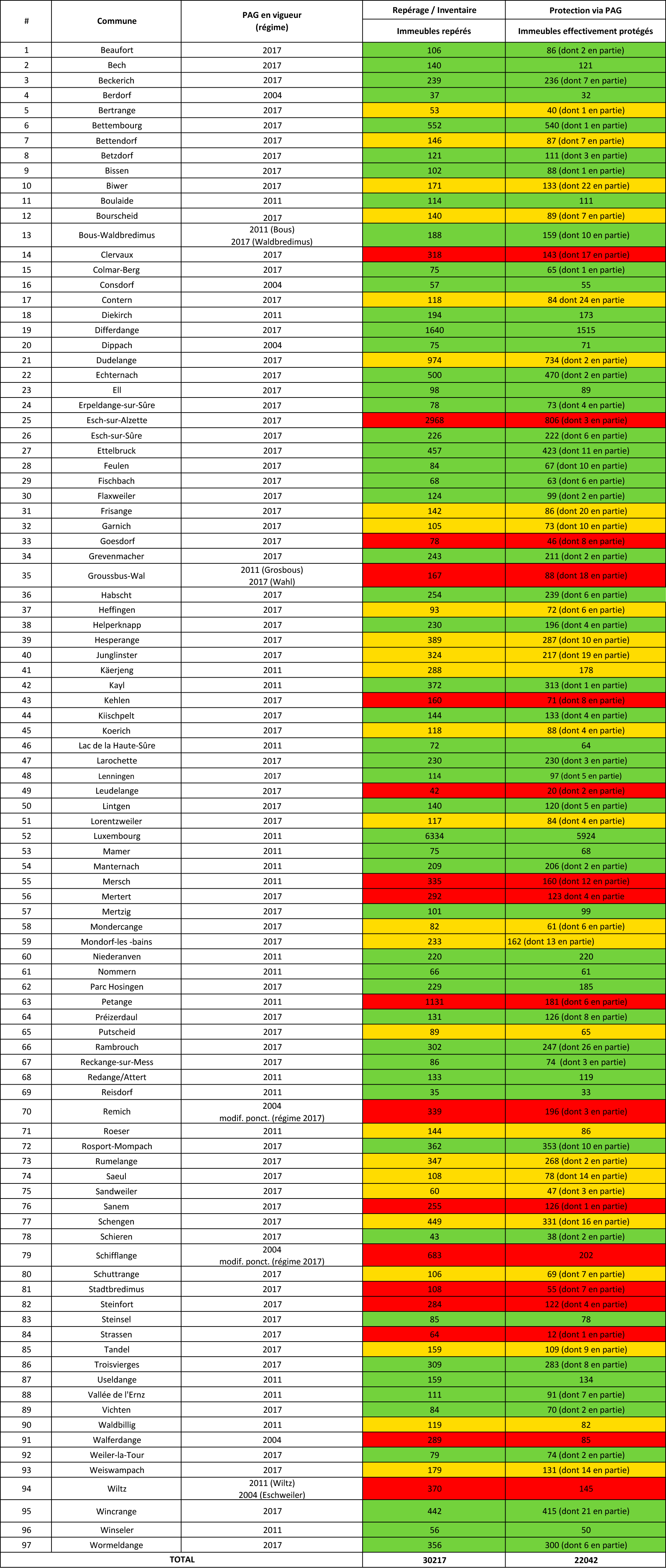 Après les hésitations, voire craintes des responsables communaux, parfois légitimes et souvent surfaites, ces résultats tangibles pour la protection concrète du patrimoine bâti nous semblent bons. Beaucoup de communes ont eu l'audace et la persipacité que notre patrimoine réclame. Le tableau retrace en vert les communes ayant protégé plus que 80 % des immeubles repérés et en jaune celles ayant protégé plus de 60 %. En rouge apparaissent les communes, qui malheureusement, n'ont pas assumé suffisamment leur rôle protecteur du patrimoine bâti local. En effet, peu de patrimoine y a été protégé, ce qui laisse moult immeubles à la merci notamment des promoteurs.